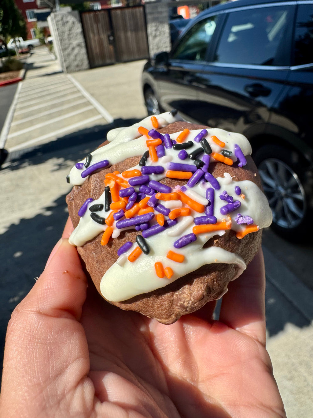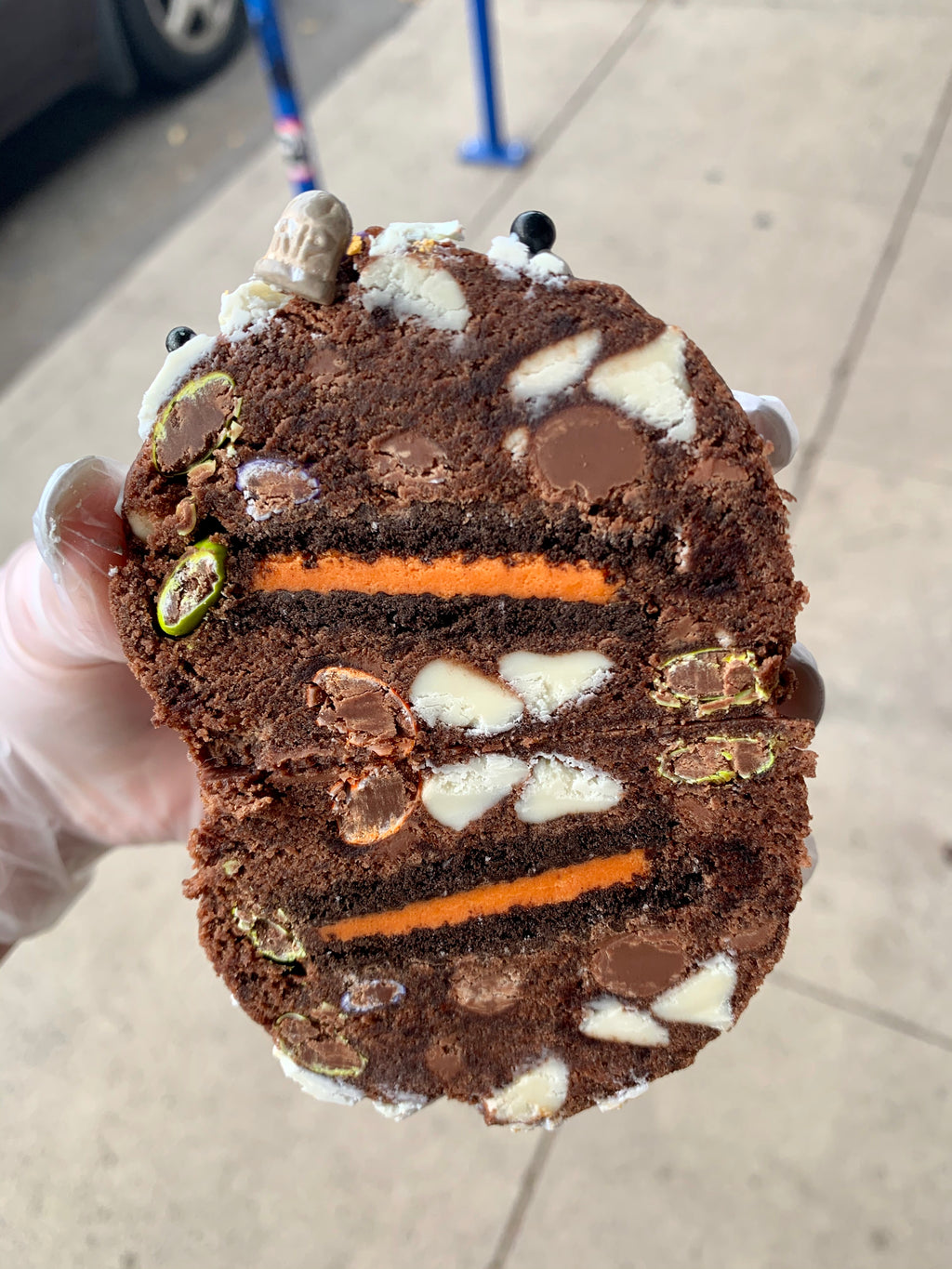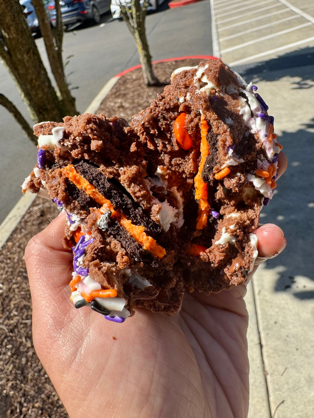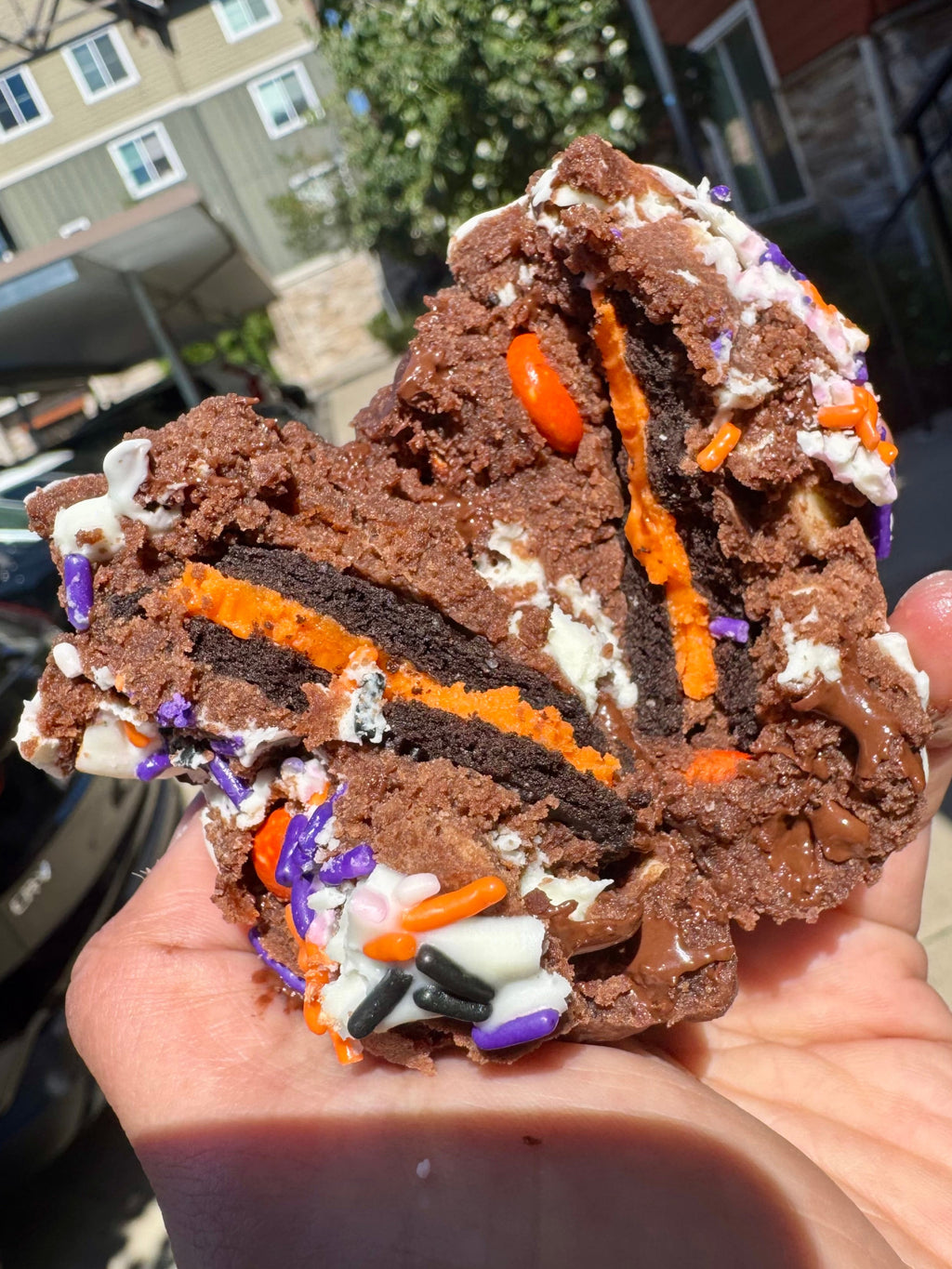 A HALLOWEEN MUST COOKIE! Our Double Fudge Cookie Base with Chocolate Chips, White Chocolate Chips, and Halloween M&Ms. It’s stuffed with a Halloween Oreo, drizzled with white chocolate, and finished with Halloween sprinkles! Simply wonderful!