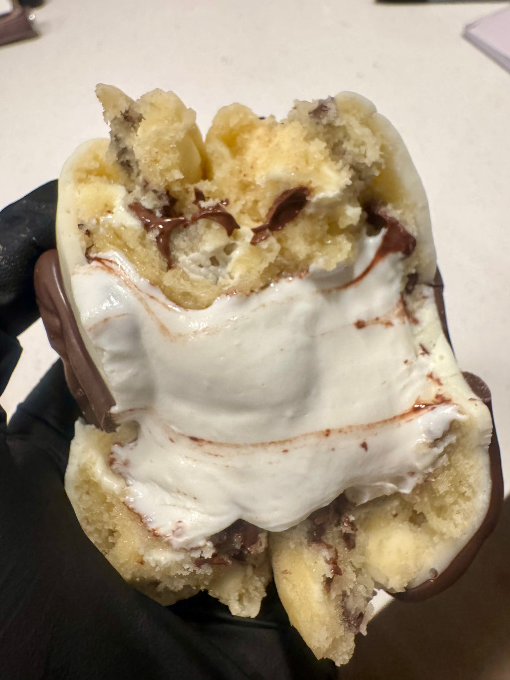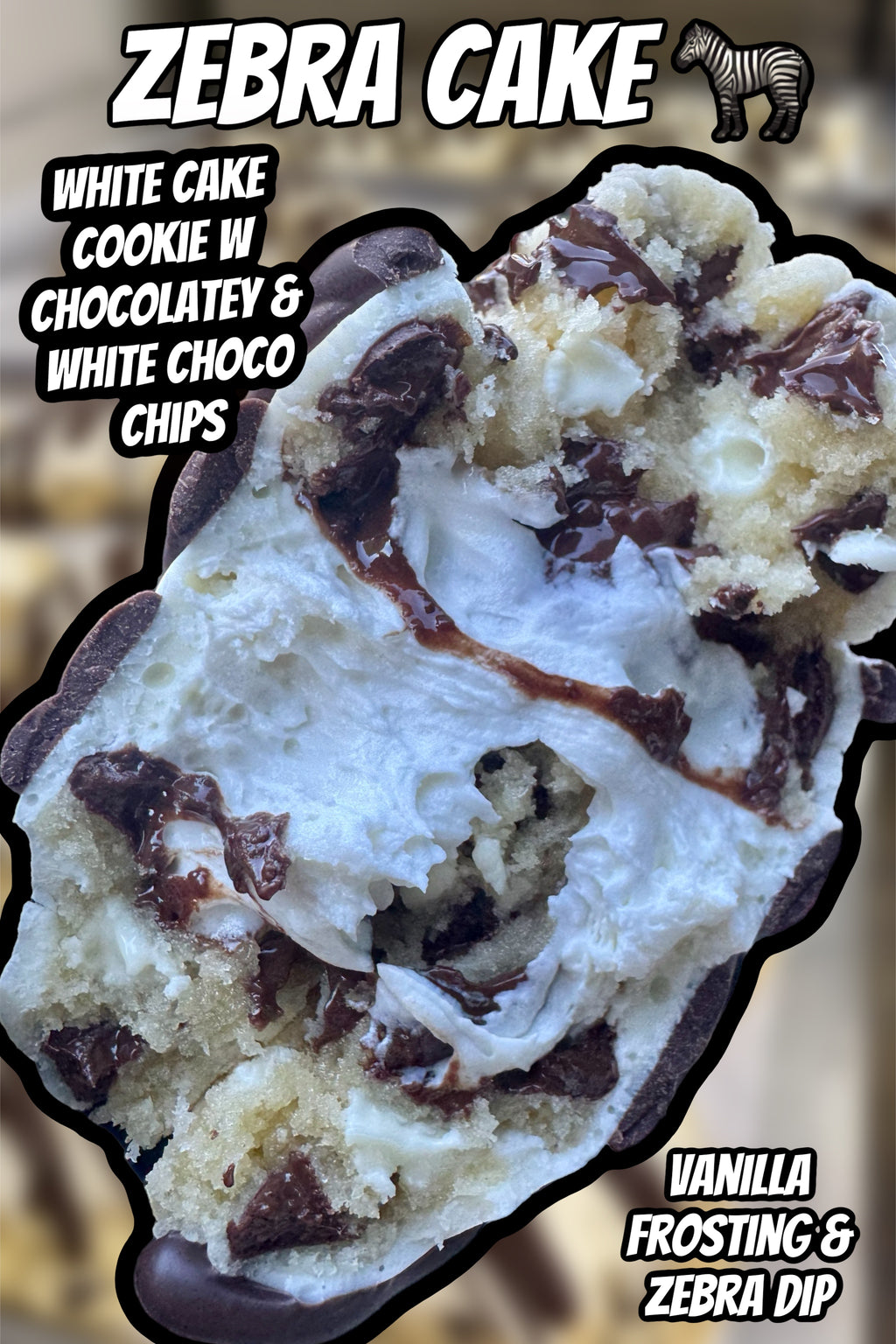 a brand new cookie flavor inspired by the famous snack cake! we took our vanilla cake batter cookie base and loaded it up with chocolatey chips and white chocolate! stuffed with vanilla buttercream.. but wait, there’s more! dipped in white fudge and finished with the signature zebra drizzle 🦓